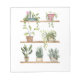 Visning för krukväxter. Tre rader krukväxter på hyllor. Handmålade vattenfärger.