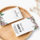 Kort för visning av blommigt tryckt med logotyp och handritade persikoblommor och grönska. Lägg till medieinformationen för social längst bak.