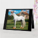Vit arabisk häst som bär hatt och träskor kort