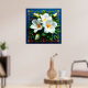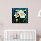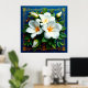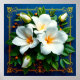 Vackert arrangerad bukett av vita blommor, inklusive stora blommor och ömtåliga mindre blommor, mot en djupblå bakgrund med gyllene ram och dekorativa hörn.