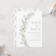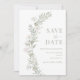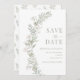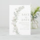 Indulge i sofistikering med vår förfinade rustik Spara datuminbjudningarna, med en delikat viskartad andedräkt av dammig grönt löv som är sammanflätad med vita blommor. Öka föregripandet för bröllop med denna unika inbjudan.