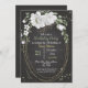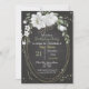 Drömlig romantisk vit blomma och grönt löv på guld, botaniskt svart födelsedagsfest inbjudan i ram. Närmare uppgifter om glitter simuleras