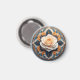 Konstnärlig framställning av en central ros omgiven av detaljerade blommönster, skapad av lagerpapperssnitt i blå och orange nyanser. Visar kreativitet och invecklad hantverkskunskap inom en geometrisk cirkulär komposition.