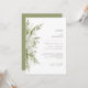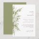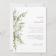 Denna eleganta bröllopsinbjudan har en blommande arrangemang av vita blommor och grönska på en krispig vit linnebakgrund. Med sans serif-typografi och subtila antydningar till handskriven kalligrafi är denna design både modern och klassisk.