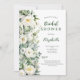En vacker vit blommigt eukalyptus greenery inbjudningskort för möhippan. Perfekt för alla säsonger.