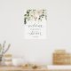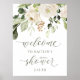 Välkomstskylt för vinter-Möhippan - White Blommigt Greenery Foliage Bouquet: Välkommen dina möhippa gäster med denna välkomstskylt på 18 x 24 tum! Det här tecknet har en vacker vattenfärgad bouquet med vita blommor, grönt och en nyck faux guld glitter. Den vackra välkomsten och duschen utförs i ett modernt kalligrafiskript som kompletterar denna design perfekt!