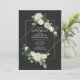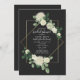 Vattenfärginspirerad illustration av gröna och vita blommor med geometrisk ram över en mörk grått-bakgrund med möhippa i vit text.