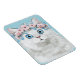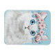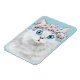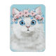 Den här designen har en söt vit kattunge med rosa och blå blomhalo.