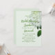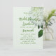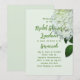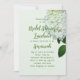 Mall för inbjudan till vit blommigt-part. En vit, söt, lätt vattenfri vattenfri blomma med grönt lövs är bilden på mycket papper grönt i blek. Modern manus används för party och namn, eller namn, för hedersbetygelser. Text är skript och skrivs ut i grönt. Utformningen är perfekt för en vår-möhippa, en sommartid, en förlovningsfest eller en milstolpe på födelsedagen.
