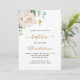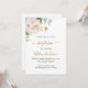 En vit bakgrund dekorerad med eukalyptusgrönska, en vit pioen och gyllene blad. Personifiera och barnets namn och ceremonidetaljer. Svarta och gyllene bokstäver.