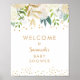 Vit blomsterrik guld baby shower välkomstskylt poster