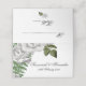 Detta charmiga bröllopsbordskort för dina bröllopsgäster på mottagningen har en vacker bukett av vita rosor och ormbunkar på den vänstra kanten och hörnet. Alla detaljer kan enkelt ändras för att passa, och det har också en liten vit ros på baksidan av kortet, under där gästernas namn skrivs in.