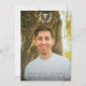 Ett elegant, könsneutralt examensfoto-kort för att fira professionella sjuksköterskekompetenser. Funktioner: ett foto som sträcker sig över hela framsidan med överlagrad text och kaducé-symbolen (med förkortningen "RN") omgiven av en lagerkrans. Malltexten för examenstagarnas detaljer är helt anpassningsbar, så typsnittets storlek, stil, färg och placering kan ändras. Baksidan har ett andra mindre foto och malltext för ett längre meddelande. Designen finns i andra färger, med en Asclepius-symbol, med mönster för specifika kvalifikationer (MD, DO) och med olika layouter/ orienteringar i min butik.