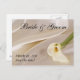 En vit calla lily mot en vit, satinbakgrund är en elegant påminnelse om att spara datum. Anpassa detta vykort med dina namn och datum!