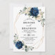 Bröllopbjudan till mörkens marinblått blommigt med elegant bouquet av marinblått, royal blått, vitt, guld, champagneelvorik, färg ro, hydrangea, ranunculus, peony, blomknoppar och sage grönt eucalyptus löv och elegant vattenfärg med runda glittrens geometriska neutralt ram. Kontakta mig om du behöver hjälp med anpassning eller om du behöver någon annan produkt med den här designen.