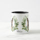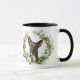 Mugg har en konstnärs vattenfärg porträtt i en vacker belgisk Malinois-hund inom en vit daisy och grönt löv. Bilden skrivs ut två gånger på mugg, med ditt namn eller monogram vid grund mellan bilder.