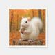 En flytande vit ekorre med starkt ögon håller en akorn medan sitta på en träd-stump, mot bakgrund av en kraftig höstlöv