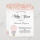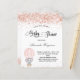 För en babydusch, fira en flicka. En vit bakgrund. Dekorerad med , ro guld faux glitter damm och en söt liten baby elefant flicka i en luftballong. Anpassa och lägga till uppgifter om namn i mamma till namn och party. Namn och texten: Baby Shower är skrivet med ett handskript i stil