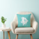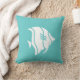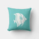 del av den havsinspirerade dekorationen vit fisk på tealblå kudde på ena sidan och teal och vit rand på baksidan.