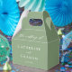 Den här enkla heliga grönten bröllopsboxen innehåller elegantens vita skript för en utomhusceremoni i en naturinställning. Minimalistisk typografi på fredliga ljust grönt lådor för en plats utanför träd nära en skog.