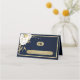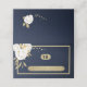 romantiska vita blommor med vackra guld-löv på ett guld-rektangulärt geometriskt blått platskort i eleganten ram