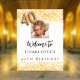 Ett välkommet poster för en feminin och glamorös 40-årsdag party. En vit bakgrund som dekorerats med colden konetti. Anpassa och lägg till ett foto och namn. Nummer 40 skrivs med ett stil-teckensnitt med ballong.