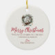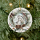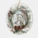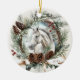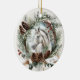 Vacker vit-/ grått-häst i en rustik julandedräkt med pinekoner. Personlig (året på framsidan och texten på baksidan) julprydnad för hästälskare.