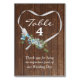 Vitt revben med bog, blommor och vivel på rostfritt brun lingträ för bordsnummer. All text kan ändras.