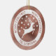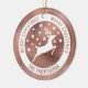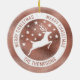 Desteis vita silhuettedesign för hjort tillsammans med några stjärnor på en faux-rosa-folie med struktur guld (NOT REAL FOIL). Omkring hjorten finns det en vit cirkel som lyder: "God jul" två gånger, och på grund finns det ett anpassbart textområde för en familjetext av namn eller annan anpassningsbar. OBSERVERA: folien är inte äkta. Det är en digitalt skapat bild som kommer att skrivas ut på produkten.