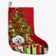 Cute white pudel vid Julgran och vänta bland presenter hundälskarnas julstuga helgdag