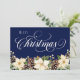 Vitt julkort för Poinsettia blå Helgdag. Ett blått julkort med vit Poinsettia, bär och gräs-dekoration med vattenfärg och ett vitt kort julskript. Du kan anpassa "merry" till Lycklig, Jolly eller annat om du vill. På baksidan med vit brev mot en mörk blått bakgrund lägger du till din jul hälsning och din familj namnteckning och innevarande år. Ett traditionellt julkort med ett modernt val från färg. Se de andra matchande produkterna i den här samlingen för ett sammanhängande tema.