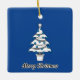 En elegant vit julgran med blåa glödlampor prydnader dekorationer, ett silverfärgat band och en silverstjärna högst upp. Granen är planterad i en vit kruka. Designen kompletteras med en "God Jul" text. Önska din familj och vänner en God Jul på ett elegant sätt.