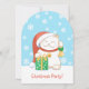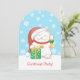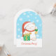 Leende vit katt i traditionell röd julhatt som håller en stor inslagen present och önskar alla en riktigt glad jul! I sin vänstra tass håller katten högt en gyllene klocka med en grön slinga. Söt och originell inbjudan till julfest!