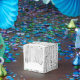 Vit julklapp. Lättare och tom grönt i slutet av gränden i fåglargroven. Liten bänk, lång träd, ingen runt. Tyst snöfall. Julstämning. God jul och Gott nytt år!