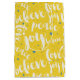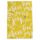 Julvit textdesign kärlek, fred, glädje och tro med blå stjärnor över gultens bakgrund. Mall för presentsäck för anpassade