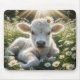 En flytande vit skotsk kalv ljuger fredligt i ett fält av blommande daisy som badats i det varma solljuset