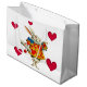 En stor vit, glansig presentväska med vintagen Alice i underlandsbilden, på framsidan av den vita kaninen i fullt regalia mitt i vita röda hjärtan. Se hela Wonderland Gift Bag-samlingen i SPECIELLA TUUCHES | Avsnittet party favors.