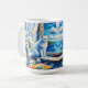 Vit katt i fönstersill Tittar ut vid havet Kaffemugg