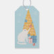 Vit katt leker med prydnadsföremål från Julgran Presentetikett