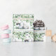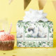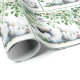 En flytande vit katt är lekfullt ljugande på ryggen och når upp till ett gren med grönt löv där en liten fågel är sittande.