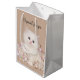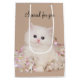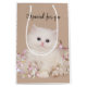 Beklagligt söta vita persiska kattunge med pastellpresenter som omsluter band som lockar henne för att spela katt som älskar vilken tillfälle presentväska som helst