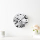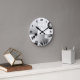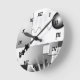 Väggklocka med en lekfull konsdecodesign i svartvitt.