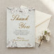 Uttryck din hjärtliga tacksamhet till dina vänner och familj med detta eleganta tackkort för bröllop. Designen har ömtåliga illustrationer av vita körsbärsblomgrenar som ramar in toppen och botten, mot en subtil, fläckig pergamentliknande bakgrund för en touch av vintage charm.