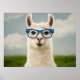 Vit lama med blå glasögon - Stjort och Trendig Foto från djur. Vita lamamablåa glasögon i snyggten sport. Den här charmerande bilden fångar lamas lekande personlighet och unika utseende.