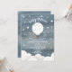 En inbjudan till babydusch med en mörk blått vattenfärg inspirerad bakgrund med vit text omgiven av stjärnor och illustrationer av vit luftballong och moln. Anpassa med information om tillfälle.