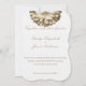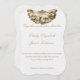 En bröllopsinbjudan med en vit miniminivå med gyllene solrosininspirerad design med vit text.
