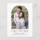 Meddela din bröllop-dejt i stil med vår moderna fotobok spara vykortet. Det enkla datumet för att spara vykortet innehåller förlovningens foto inuti ett vitt fack ram. "Spara datumet" visas i svart, modern serif- och script-typsnitt med vit bakgrund. Anpassa framsidan av datumet för att spara datumet genom att lägga till namn, datum för bröllop och plats för bröllop. vykortet återgår till visning av returadress- och bröllop-information.
