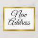 'Ny adress' visas i svart skrift på framsidan av detta flyttmeddelande. På baksidan kan du anpassa ditt kort med din adressändring med ditt namn, nya adress, e-postadress och/eller mobilnummer. All text kan redigeras eller raderas.