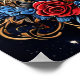 En illustration av eleganten med ett vitt svan och ett svart svan omgivande omgivande, omgivet av rött och blått ro, dekorationer med gyllene hjärta och ett nattligt himmel med stjärnor och halvljus måne.