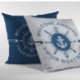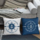Elegant marin blå och vit ratt med ett rep- och båtankare, anpassade vit text. Vita prickar och rand formar inslag. Färg på baksidan av kudden.